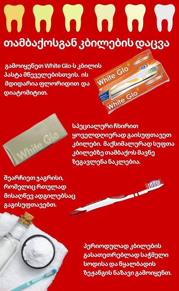 • გაიხეხეთ კბილები დღეში ორჯერ ფლორიდის (fluoride) შემცველი კბილის პასტით. ყურადღებით შეარჩიეთ კბილის ჯაგრისიც. ჯაგრისის ფორმა და სტრუქტურა ისეთი უნდა იყოს, რომ კბილის პასტამ მაქსიმალური შედეგი მოგიტანოთ. • სპეციალურად მწეველებისთვის კბილის პასტების ერთ-ერთმა წამყვანმა ავსტრიულმა მწარმოებელმა White Glo-მ შექმნა მათეთრებელი ფორმულა. ის ფლორიდით განსაკუთრებულად მდიდარია და ამავდროულად, შეიცავს დიატომიტს. ეს სპეციალური ფორმულა კბილებიდან თამბაქოს ნადების მოსაშორებლად და სუნთქვის გაუმჯობესითვისაა შექმნილი. მისი მიკრო კრისტალები კბილიდან თამბაქოთი გამოწვეულ სიყვითლესა და ლაქებს აშორებს. ის სრულიად უსაფრთხოა კბილებისთვის ყოველდღიურად გამოსაყენებლად. White Glo-ს შეფუთვას მოყვება კბილის ჯაგრისი და ჩხირი.